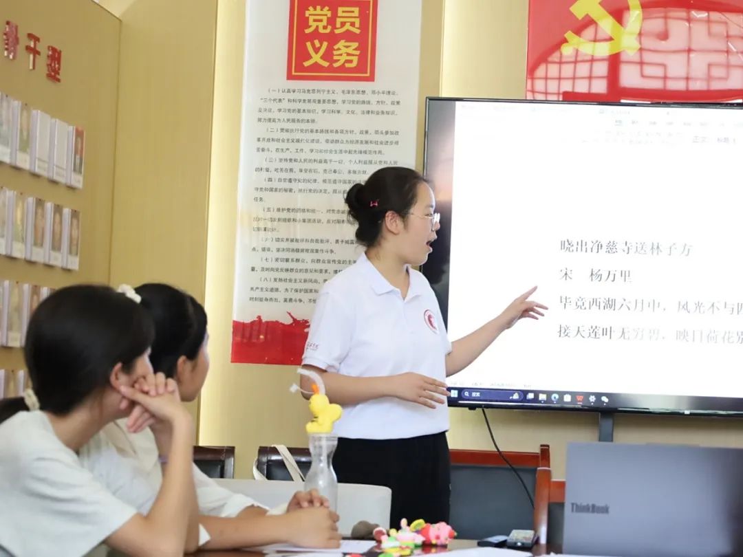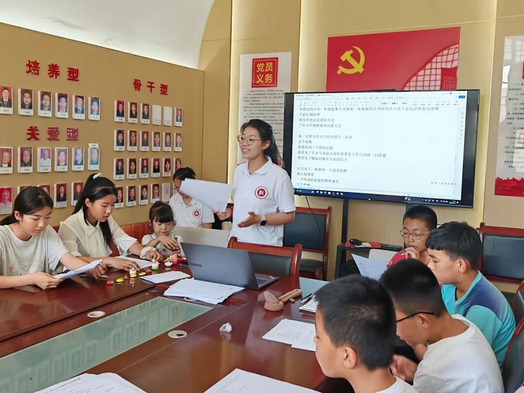 打造特色课堂,点亮乡土童趣 为丰富孩子们的学习体验,实践队精心设计了一系列特色课程:朗诵课上,队员们教孩子们《月光下的中国》,嘹亮的读书声回荡在山村;撕纸课上,红色的彩纸在孩子们手中变成五角星、小兔子,培养其动手能力;舞蹈课上,整齐的脚步声与童谣的旋律里,藏着最鲜活的热闹。 特色课程不仅让孩子们接触到多元文化,也让队员们发现了乡村教育的更多可能。“看到孩子们眼里的光,就觉得所有的付出都值得。”负责剪纸课的队员说,这些课程就像一扇窗,让孩子们看到更广阔的世界。