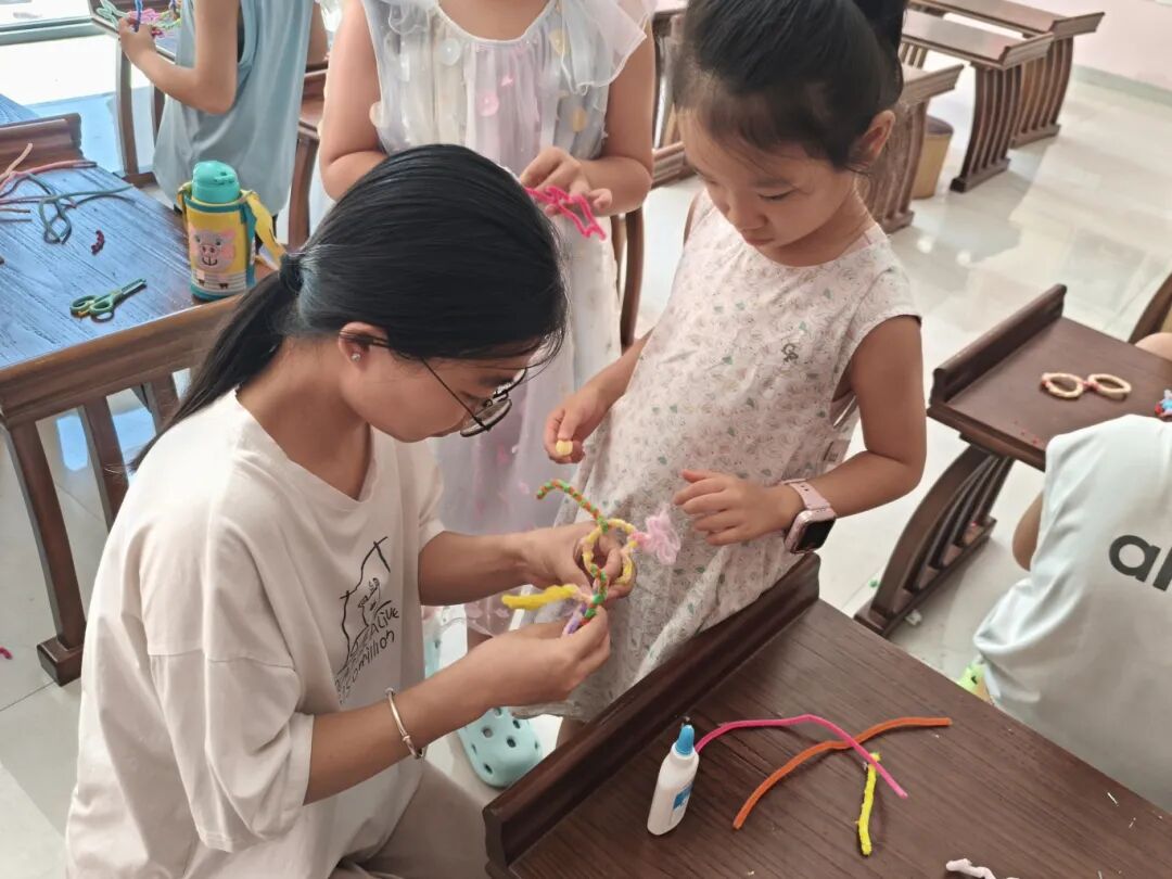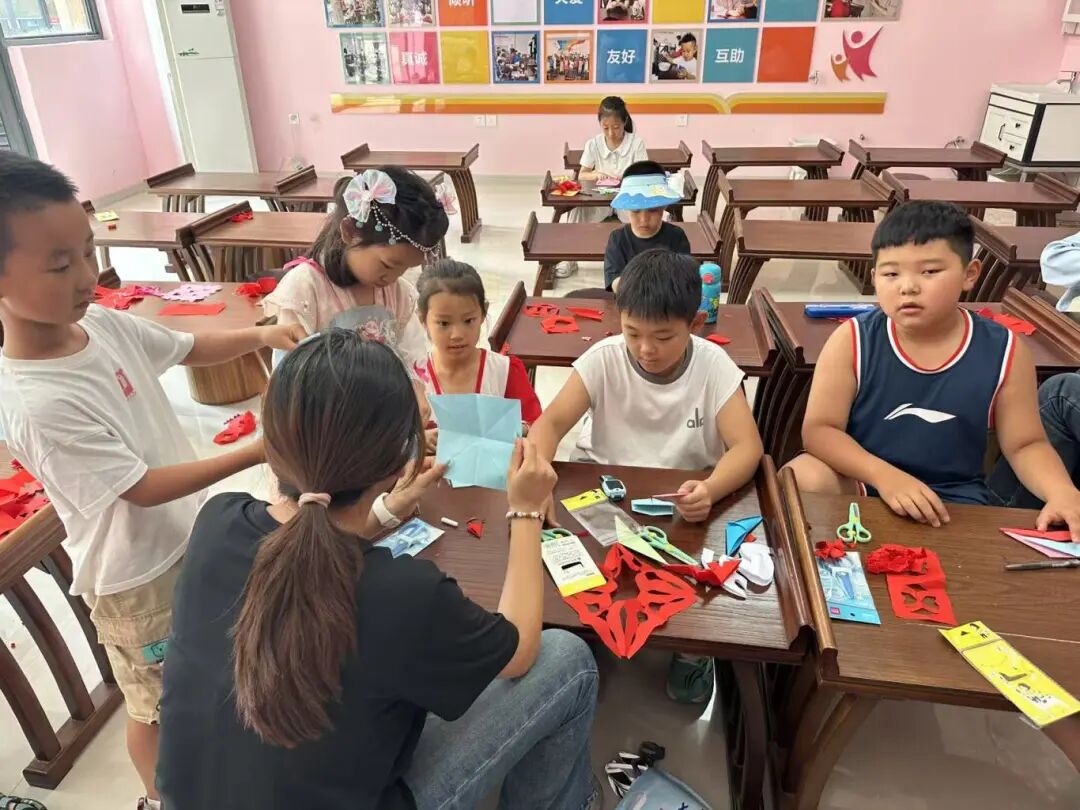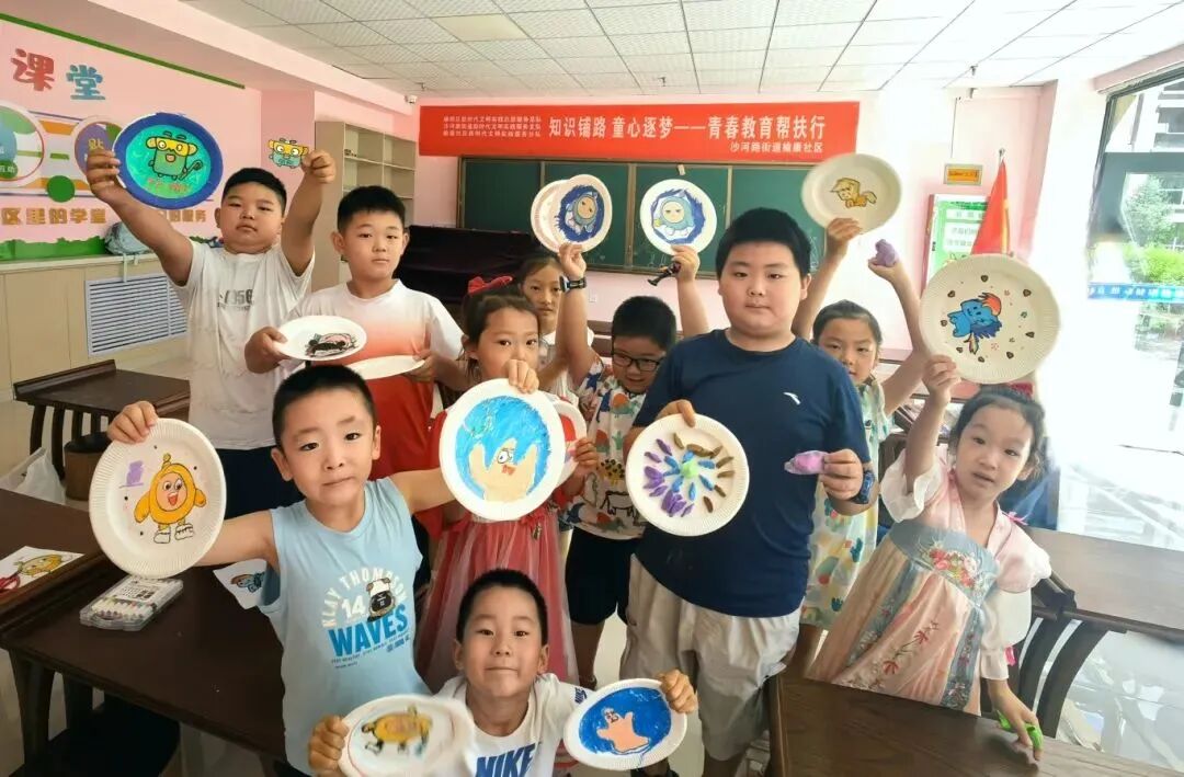 幼小衔接启蒙:用趣味点燃兴趣 针对幼小衔接阶段的孩子,志愿者们精心设计了剪纸、折纸、绘画、画盘子及泡泡泥等课程,以动手实践激发兴趣、培养能力。剪纸课上,志愿者手把手教孩子们掌握剪刀的使用技巧,从简单的几何图形到可爱的动物造型,当红纸在指尖变成一个个生动的图案时,孩子们眼中的惊喜与成就感格外动人;折纸课上,白纸在志愿者的引导下化作千纸鹤、小船、青蛙,孩子们举着自己的作品相互展示,欢声笑语此起彼伏。 绘画与画盘子课程则给了孩子们自由表达的空间,他们用画笔在纸盘上描绘出心中的世界,有五彩的天空,有会微笑的太阳,还有和志愿者老师一起做游戏的场景;泡泡泥课程里,柔软的橡皮泥在小手中变成水果、小动物,志愿者们在一旁耐心指导,偶尔帮孩子们修整造型,指尖的触碰拉近了彼此的距离。