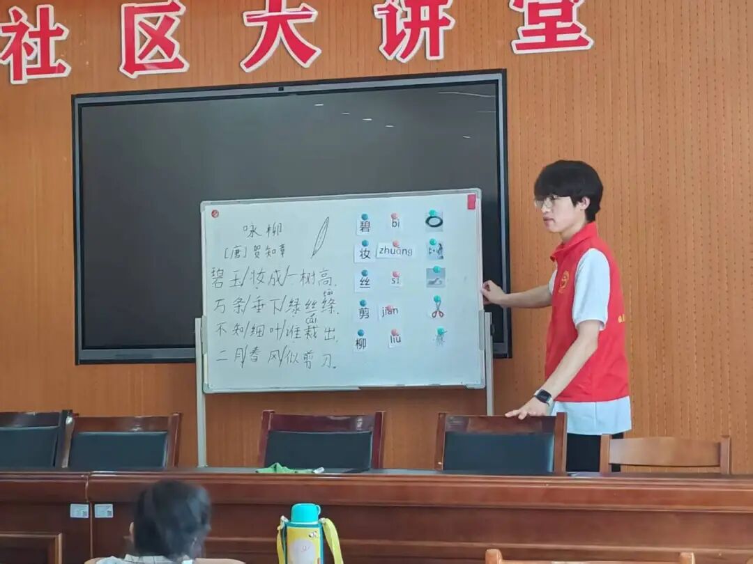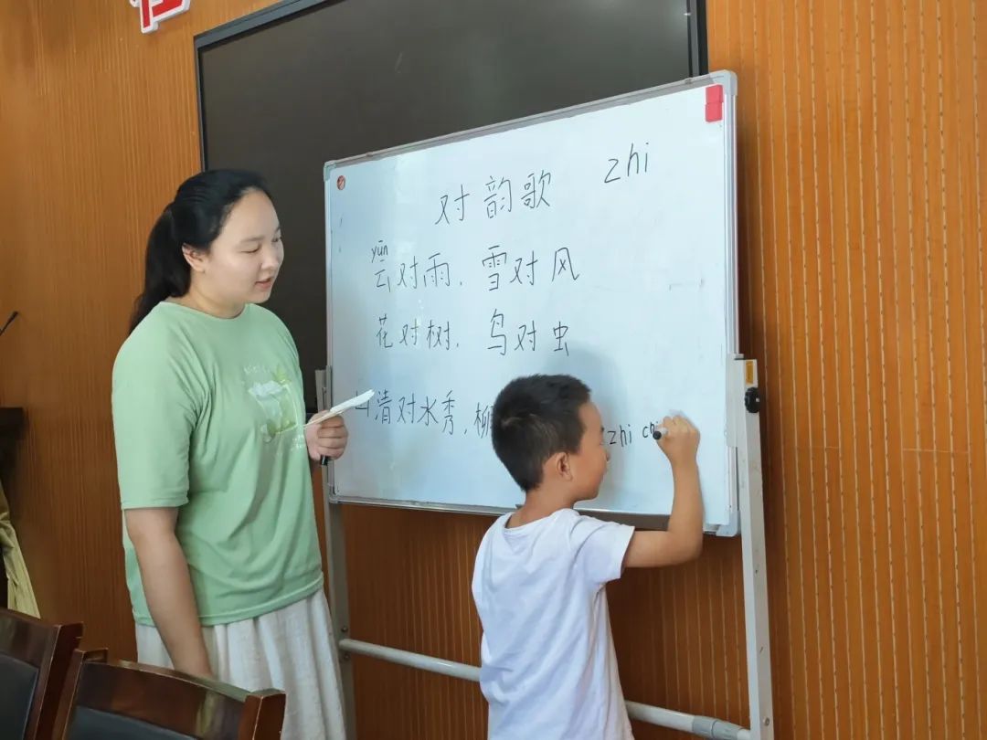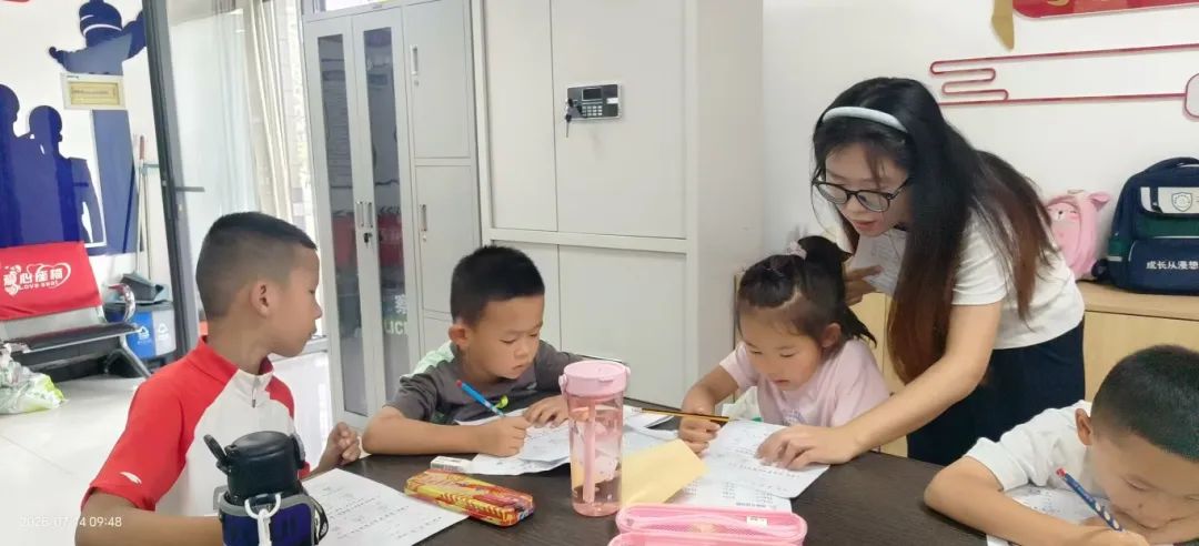 学龄儿童辅导:用耐心助力进步 与此同时,针对三到五年级员工的假期作业辅导也同步开展。志愿者们根据孩子们的学科薄弱点分组辅导,数学题讲解时,他们会结合生活实例拆解难题,“比如这道应用题,就像你们分糖果,先算清楚总共有多少,再看分给几个人”。 语文拼音指导中,他们结合日常场景练拼读,“看这张纸,‘jiǎn’是j开头,舌尖抵住下齿背,跟老师一起读——ji-ǎn-jiǎn”;遇到平翘舌混淆的孩子,就用手势辅助,“说‘zhi’的时候,舌尖要翘起来,像小舌头在敬礼,‘zi’就不用,舌尖轻轻碰牙齿”。遇到性格内向、不敢提问的孩子,志愿者会主动坐在他们身边,轻声询问,用耐心化解他们的拘谨。
