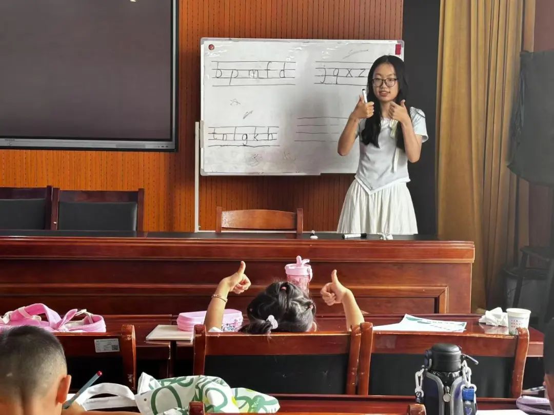 志愿者实践感悟:在教育中遇见成长 “十天的相处,让我真正理解了‘教育是一棵树摇动另一棵树’。起初教剪纸时,我担心孩子们坐不住,可当看到他们为了剪好一朵花反复练习,甚至主动请教时,我突然明白,真诚的引导远比严格的要求更有力量。这段经历让我知道,未来做老师,不仅要教知识,更要护好孩子们眼里的光。”--王子墨 “辅导作业时,有个孩子总说‘我不行’,可当我们一起算出一道难题,他突然拍着手说‘原来我可以’,那一刻我鼻子发酸。以前在公司学的是教学方法,现在才懂得,对孩子来说,‘相信他们能行’比方法更重要。这次实践,是我从‘师范生’向‘教育者’转变的重要一步。”--贾媛媛 “画盘子课上,一个小女孩把我画进了她的作品里,说‘老师像姐姐一样’。这句话让我记了很久。我们带的不仅是课程,更是陪伴。作为公费师范生,未来要服务基层教育,这次活动让我提前感受到了这份责任的重量——教育不只是传授,更是用真心换真心。”--周珈羽 “从备课到上课,从紧张到从容,我在孩子们的笑容里找到了成长的答案。有个男孩一开始抗拒写作文,最后却把我们一起折纸的故事写成了短文,还偷偷塞给我看。这让我明白,教育的魅力在于唤醒,而我们要做的,就是成为那个温柔的唤醒者。”--高雅琪