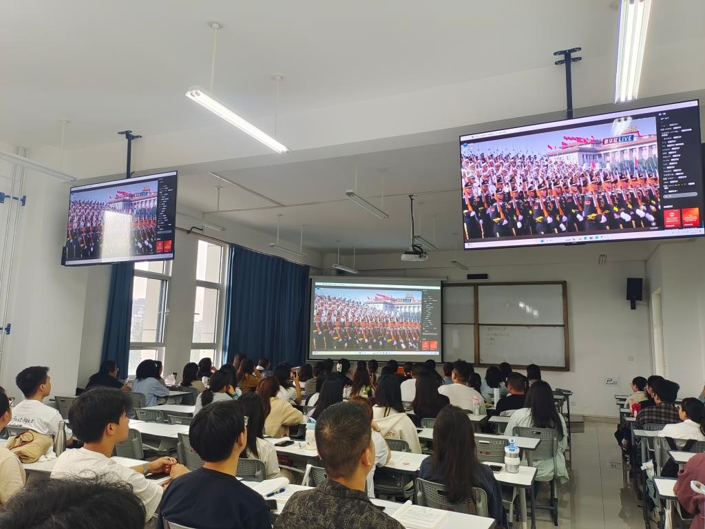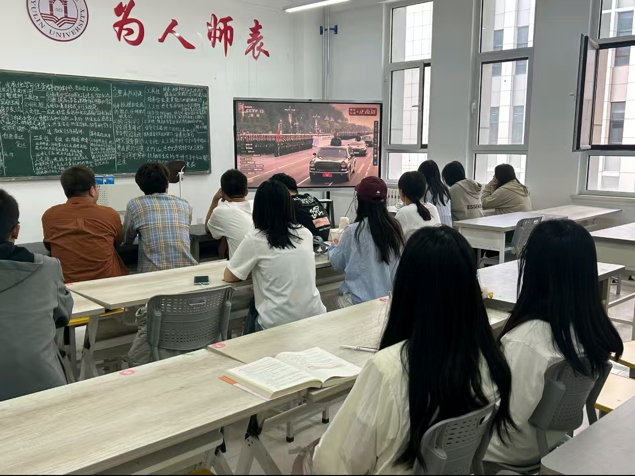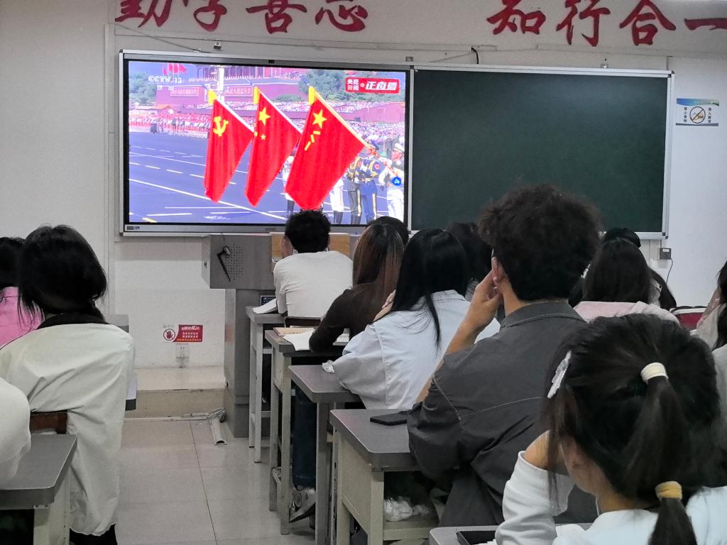 习近平总书记强调,中国人民抗日战争是以爱国主义为核心的民族精神的伟大胜利,中国战场长期牵制和抗击了日本军国主义的主要兵力,支撑起了世界反法西斯战争的东方主战场 。他指出,伟大抗战精神是中国人民弥足珍贵的精神财富,将永远激励中国人民克服一切艰难险阻、为实现中华民族伟大复兴而奋斗 。 观看结束后,全体教职工在2207开展了学习心得交流活动。交流中大家纷纷表示,要铭记历史,传承和弘扬伟大抗战精神,为强国建设、民族复兴贡献力量。作为教师,肩负着教书育人的神圣使命,就像阅兵式上的每一个方阵都有着明确的分工和使命一样,在教育岗位上也有着自己的职责和担当,要努力让每一个员工都能绽放出自己的光芒,为国家这部宏大机器输送源源不断的动力。阅兵仪式,是一场力量的展示,更是一次精神的传承。它让我们看到了国家的强大,感受到了军人的可爱,领悟到了和平的珍贵,更激发了我们作为中国人的自豪与担当。铁流滚滚,载着历史的荣光,步伐铿锵,迈向复兴的未来。